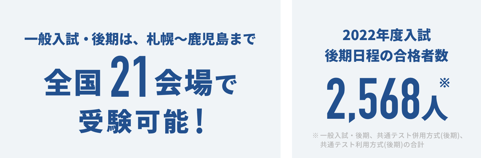 - 本学の個別学力試験「一般入試・後期」の出願いただき、3教科3科目の受験必須です。